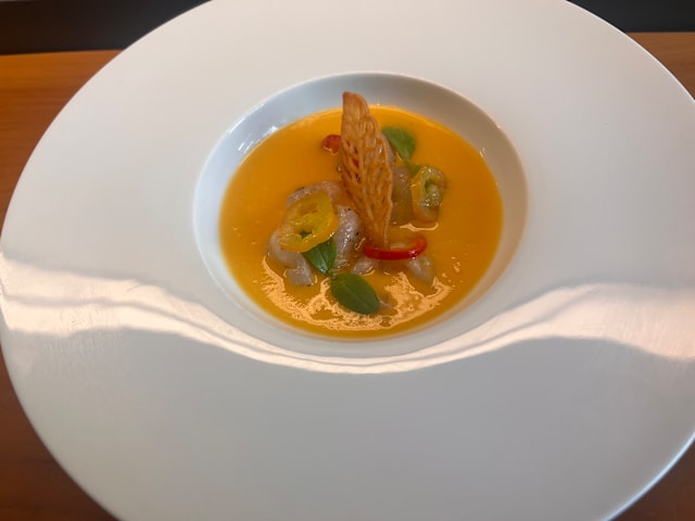 Crudo di scampi con coulis di pomodorino giallo e peperoncino semi piccante