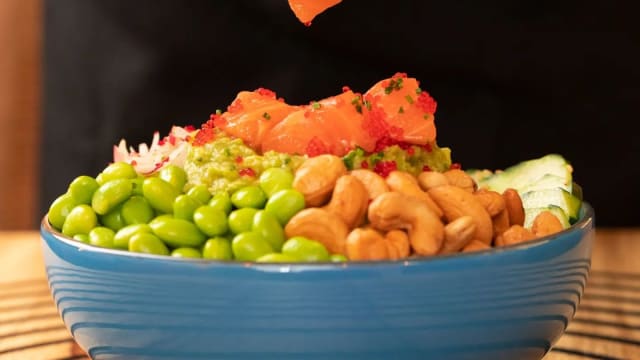 Riso sushi bianco, salmone norvegese, avocado a fette, edamame, alga wakame dry, anacardi, tobiko ed erba cipollina + salsa a scelta