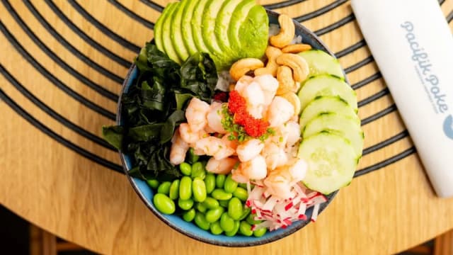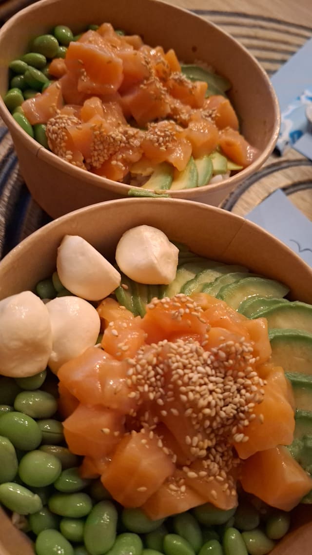 - Riso sushi bianco, salmone norvegese, avocado a fette, edamame, alga wakame dry, anacardi, tobiko ed erba cipollina + salsa a scelta