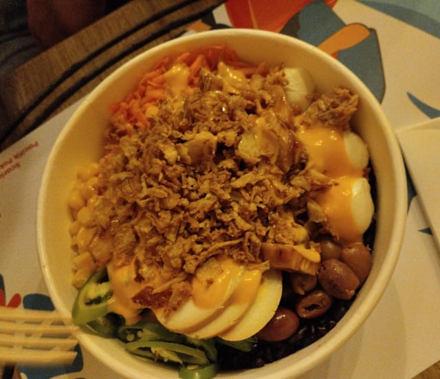 - Riso basmati, pollo marinato in salsa teriyaki, bocconcini di mozzarella, carote, avocado a fette, cavolo viola marinato, pomodorini e nachos + salsa a scelta