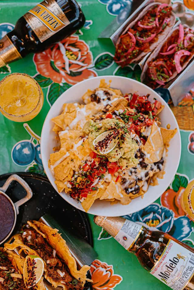 - Totopos com feijão e camadas de queijo gratinado, acompanhados pelo nosso famoso pico de gallo, sour cream e guacamole.