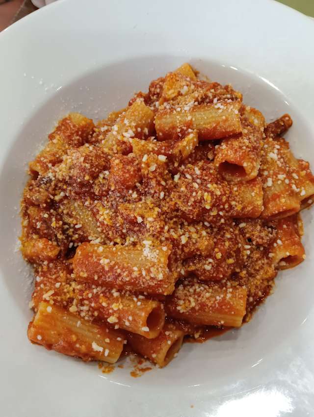 - (guanciale di norcia, pomodoro, pecorino romano)