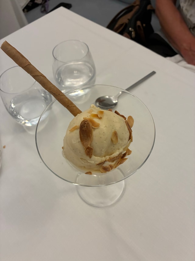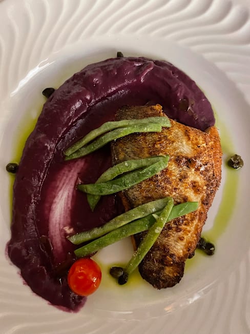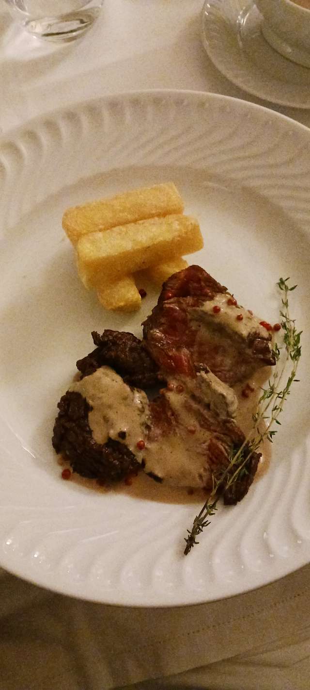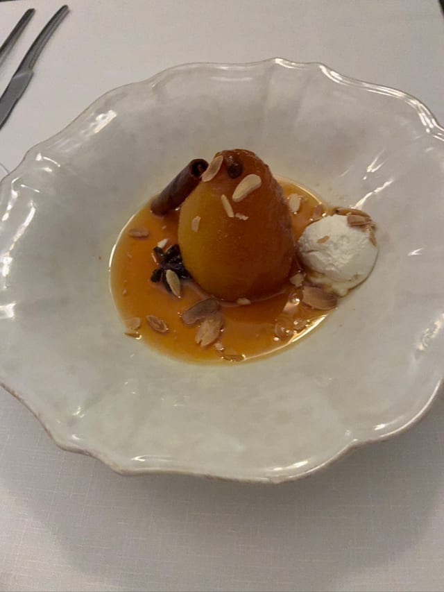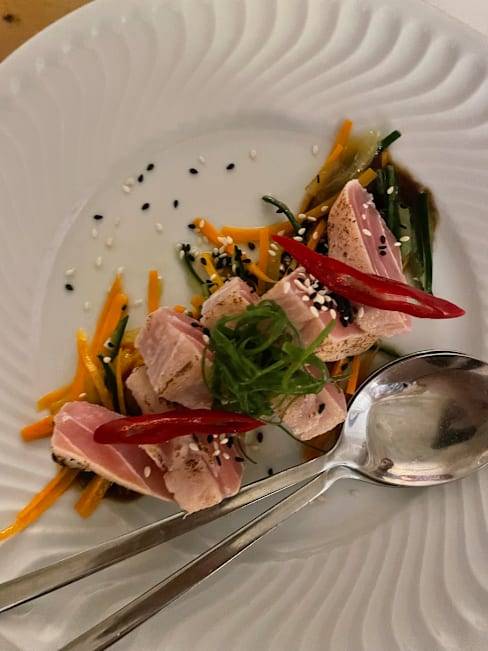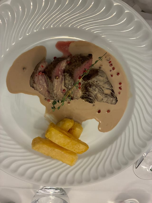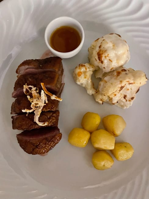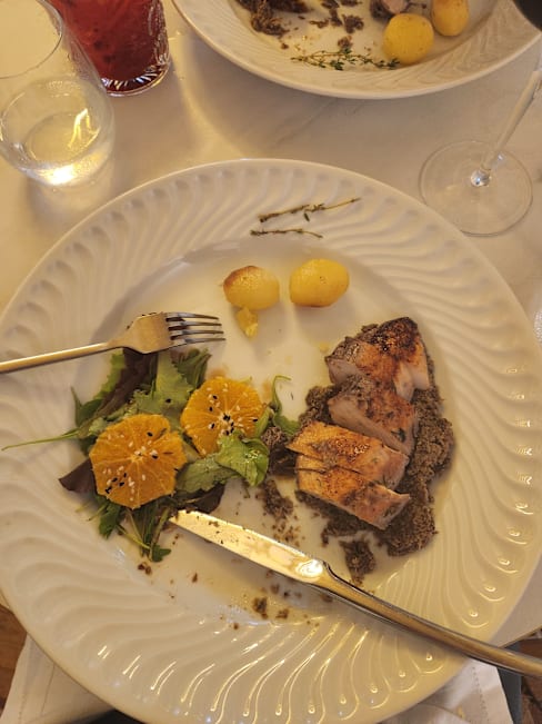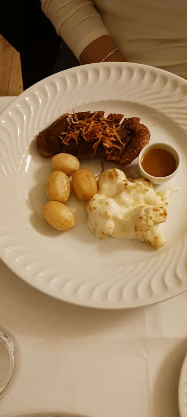 7.5/10The setting is amazing with a very charming decoration and the waiters are very nice and friendly. Regarding the food, it is a bit overpriced in my opinion. There were some details that should not happen for a restaurant like this. But first things first, the Couvert was good, with excellent butter and tuna and olives paste to spread in the bread. As a starter, we ordered the tuna, but we were a bit disappointed. It had some nerves that made it a bit hard to eat and I think some more sauce would have made it better. The tuna selection should have been more careful. The main dishes were the sea bass and the duck. The sea bass was great, with a crunchy skin and a delicious purée. The duck was flavourful when combined with the orange. However, it was too cooked, as the waiter suggested rare but then it came like medium, which made it slightly chewy… Also, the potatoes lacked some more flavour or oven time, since I like them a bit more roasted. Overall, it was good.