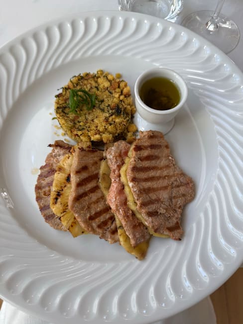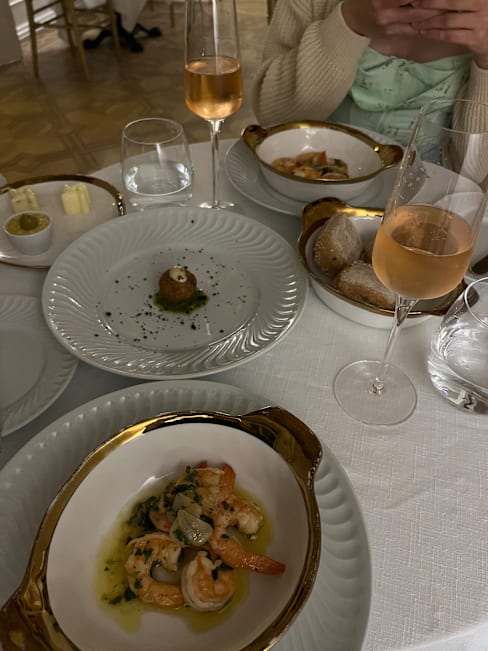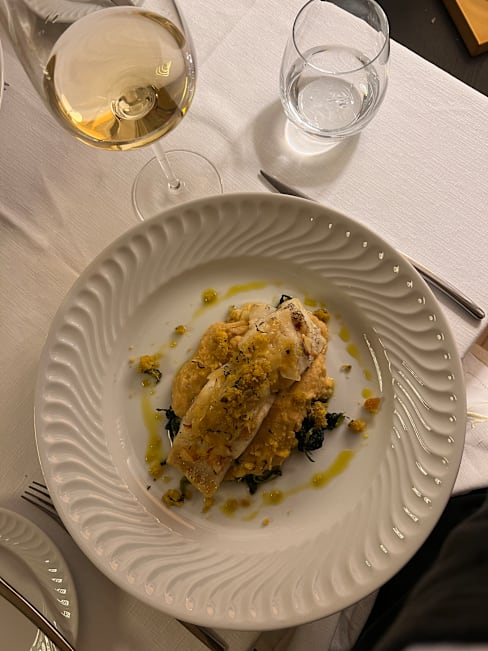7.5/10The setting is amazing with a very charming decoration and the waiters are very nice and friendly. Regarding the food, it is a bit overpriced in my opinion. There were some details that should not happen for a restaurant like this. But first things first, the Couvert was good, with excellent butter and tuna and olives paste to spread in the bread. As a starter, we ordered the tuna, but we were a bit disappointed. It had some nerves that made it a bit hard to eat and I think some more sauce would have made it better. The tuna selection should have been more careful. The main dishes were the sea bass and the duck. The sea bass was great, with a crunchy skin and a delicious purée. The duck was flavourful when combined with the orange. However, it was too cooked, as the waiter suggested rare but then it came like medium, which made it slightly chewy… Also, the potatoes lacked some more flavour or oven time, since I like them a bit more roasted. Overall, it was good.