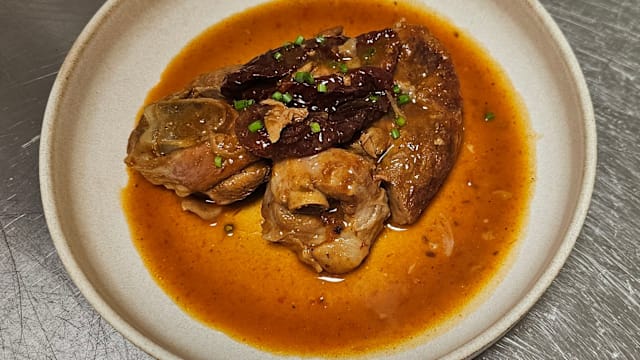 Ternera deshilachada en tomate frito, pimientos y cebollas