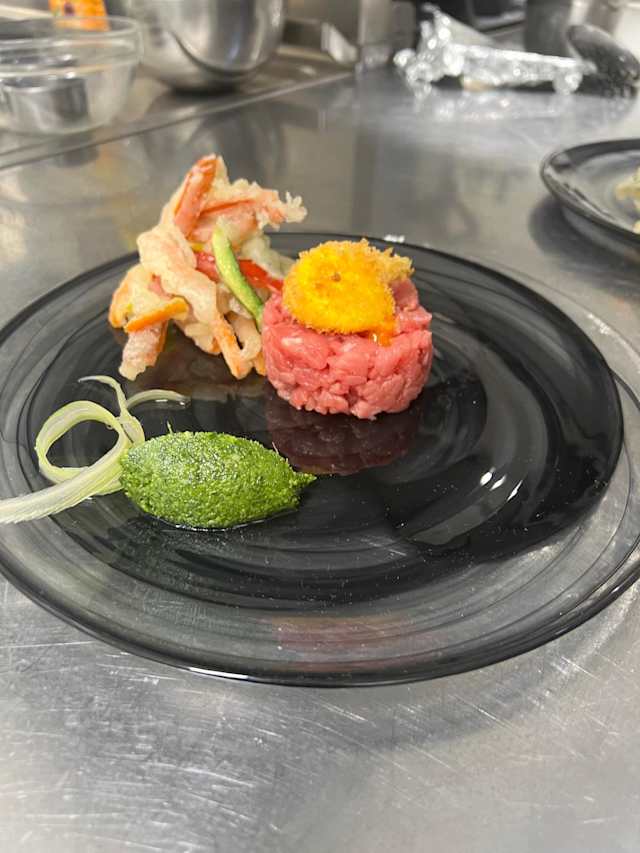 Tartare di chianina con uovo morbido fritto e verdure in tempura