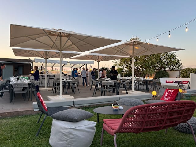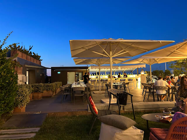 2/10We booked for what looked like a nice restaurant and was very hard to find. Told it was on the rooftop of the building, we made reservations for dinner and when we arrived upstairs there was a not so inviting area with long grass and some scattered tables (none set a placing) we were told we were in the correct place that the restaurant downstairs is no longer being used. It was so windy and no shelter and definitely no view. We read the menu and stated extra 20% charges to dine on the rooftop. No tablecloths on tables and no physical menu, you had to scan a barcode. Although we ticked the English menu only about half was written in English and it was charging quite expensive meal prices. We finished our bottle of sparkling water and told them we were going to leave and they tried to charge 10 euros for 1 sparkling water. 2 other tables also arrived for dinner but then left. Avoid if your looking for a nice restaurant to sit and dine in, there are plenty around