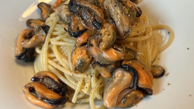 Troccoli cozze, scorzette di lime, gocce di aglio nero e mandorle tostate