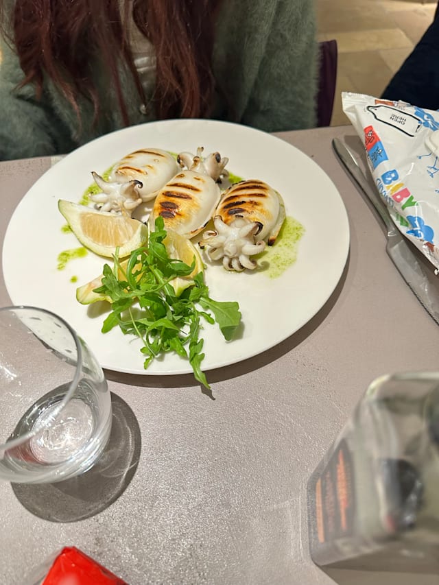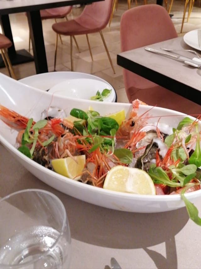 Mozzarelle, gamberi rossi, grana in cottura, insalata verde e succo di limone