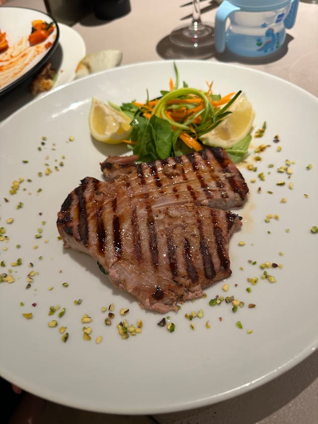 Mozzarella fuori cottura, tartare di tonno, olio, sale, pepe, stracciatella, granella di pistacchio