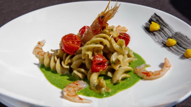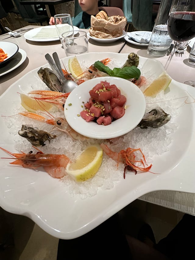 Mozzarella fuori cottura, tartare di gamberi, mela verde, olio, sale, pepe, rucola, grana, datterino giallo e rosso