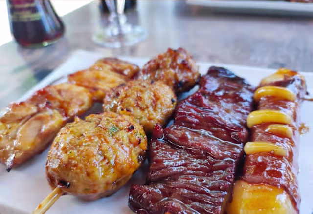 7 Brochettes assorties (poulet,boulettes de poulet, boeuf, boeuf au fromage saumon,gambas, champignon) brochettes grillées au feu de bois, (servis avec soupe, salade et riz nature.)