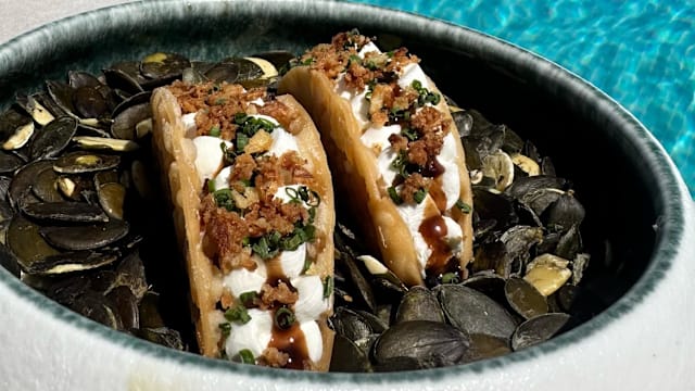 Bunuelos de viento con tuorlo e guanciale al cuore e veli di pecorino romano DOP