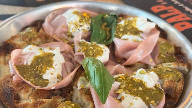 Patata schiacciata, provola di agerola, parmigiano, stracciatella di bufala, crema di pistacchio, granella di pistacchio e salame napoli croccante