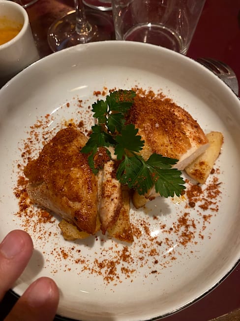 7.5/10The foie gras starter was wonderful, offset by a dollop of pear chutney, but the chicken breast and simmered beef were lackluster. When the carrot purée is the best thing on the plate and you’re a dedicated carnivore, the meal is not in the “memorable” column. Too-loud music elevated the conversation volume—perhaps an attractive ambiance for some but not our preference. Nice people but we won’t be back.