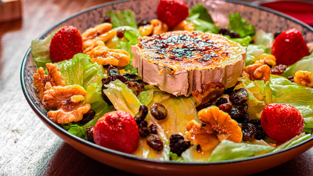 Rucúla, lechuga, nueces, queso de cabra caramelizado con azúcar moreno, tomates, confitura de higos y nuestra vinagreta casera.