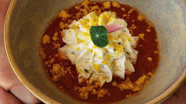 Calamari cacciaroli ripieni, topinanbur, polvere di alloro