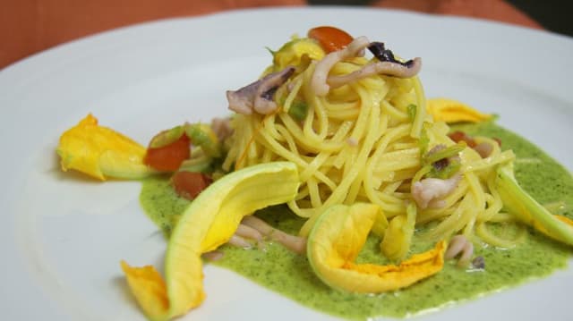 Paccheri al datterino giallo, frutti di mare, pesto di basilico gentile