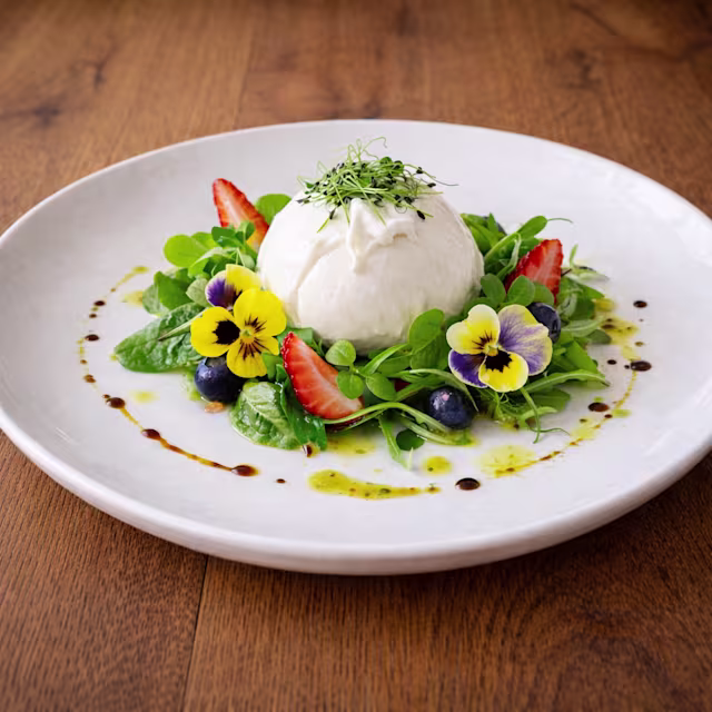 - cestinetto di pasta di riso con acciughe di cantabrico e stracciatella di Burrata, Germigli e Fiori