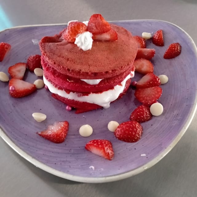 Mini pancakes pistache, aardbei, slagroom en witte choco