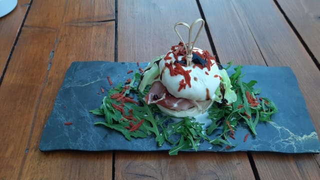 - Panghog (curcuma o barbabietola) Polpo Stracciatella di bufala locale Pomodori secchi Rucola