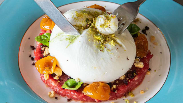 Tartare di manzo Prime Quality, burratona pugliese da 200 gr., sbrodolata di pesto, olive di Cerignola crunchy, pomodorino giallo pacchetelle e polvere di tarallo.