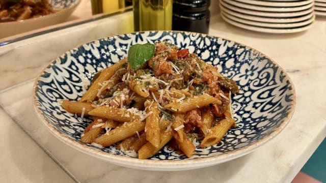 Högrev, salsiccia & rödvin i en tomatsås som långkokats till en gudomlig ragusås.
