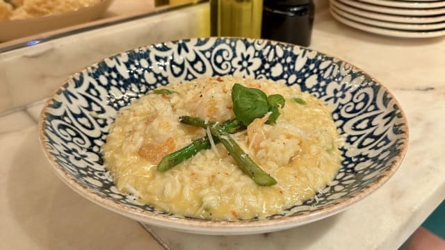 En krämig risotto med scampi räkor, lök, chili, sparris, vitlök, vitt vin, grana padano & basilika