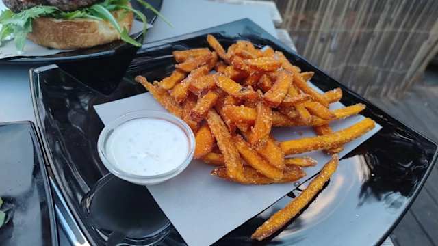 - Burger di melanzane e zucchine, chips di patata dolce croccante, pomodoro secco, spinacino fresco e maionese alle erbe aromatiche