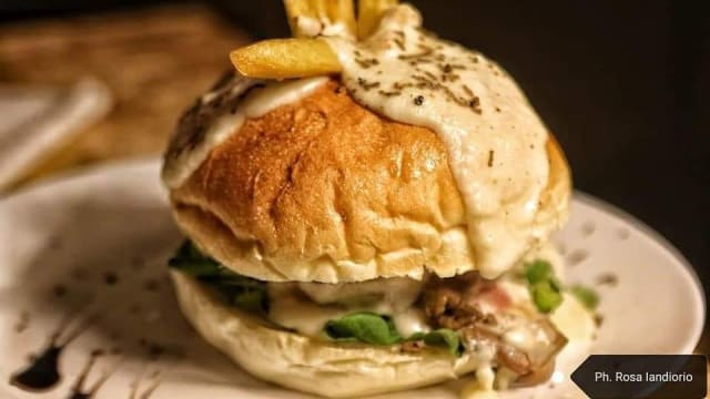 Hamburger di manzo, provola, bacon, cipola. Pomodoro