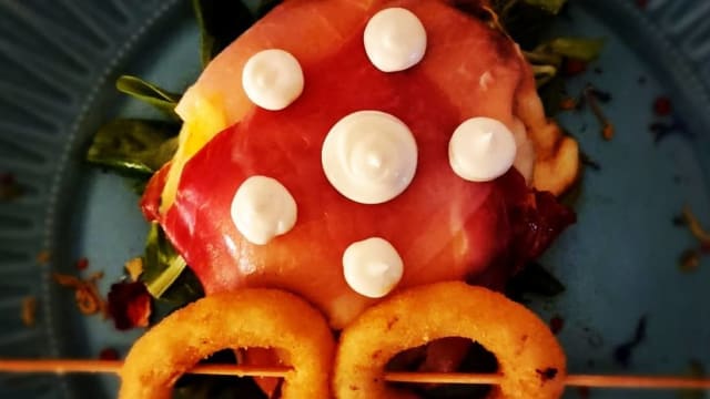Hamburger di scottona 150gr. spinacino in olio evo, caviale di melanzane al forno,bresaola di tonno rosso aff u mincato, maionese al wasabi