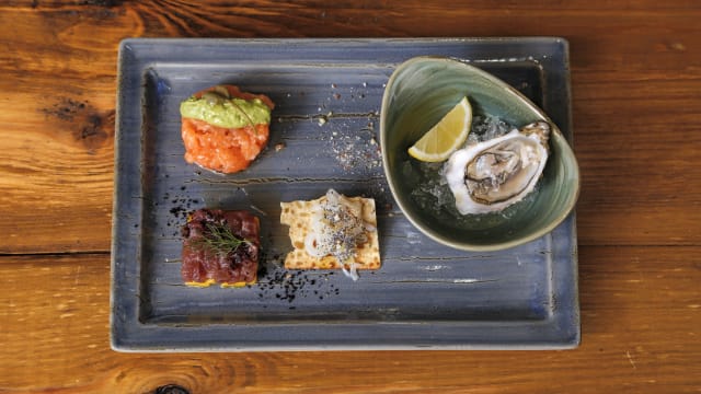 Gran crudo pano: 1 scampo,3 gambero rosso mazara del vallo, 2 mazzancolla, 2 gamberi carabineros, 2 cannocchia, 1 ostrica gillardeau, 1 mini tartare