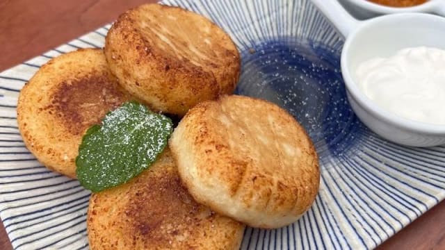 Prato tradicional ucraniano a base de quiejo fresco, servimos com creme de leite e compotas à escolha: laranja ou morango
