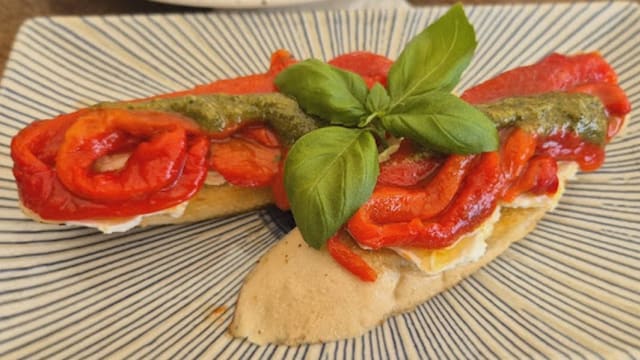 Bruschetta com pimentão assado e queijo de cabra e pesto