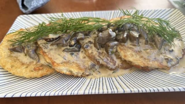 Prato tradicional ucraniano de batatas e servido com molho de cogumelos