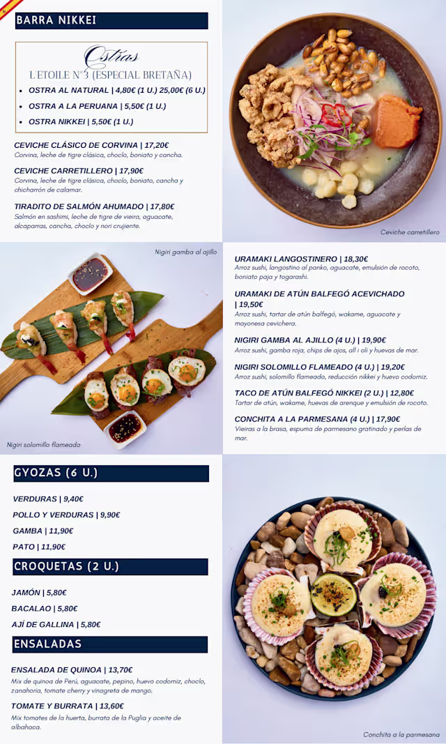 Attentive service, good advice in choosing food and wine. Beautiful presentation of all the food. Ate tapas, gyozas, ceviche, maki rolls, duck and scallops with Parmesan foam. Fantastic tastes in every dish. For dessert the homemade Peruvian cake tres leches with ice cream was very good! Definitely be back when visiting Salou. This place is a hidden gem!
