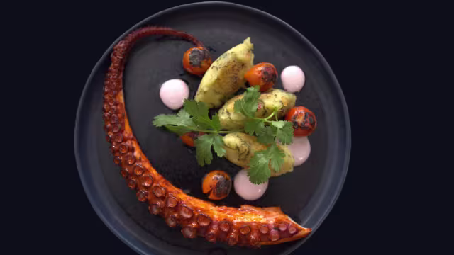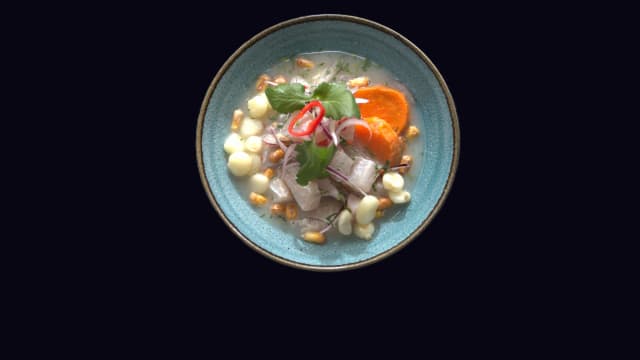 - Corvina, leche de tigre clásica, choclo, boniato, cancha y chicharrón de calamar.