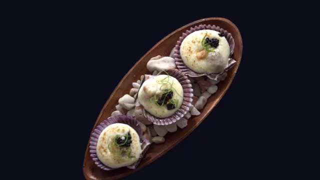 - Vieiras a la brasa, espuma de parmesano gratinado y perlas de mar.