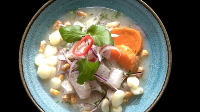 - Corvina en leche de tigre, choclo (maíz hervido) , boniato, cancha (maíz tostado).