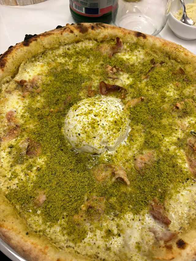 - Crema di pistacchi tostati, scamorza affumicata, mozzarella fiordilatte, bacon croccante, burrata, farina di pistacchio