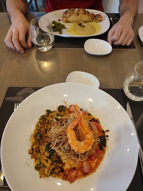 10/10+5It was a delicious meal! We have shared the couvert with 2 delicious pâtés (shrimps with cauliflower and foie graus with mushrooms) great olives and butter, then a starter of mushrooms with cheese and bacon, then we have shared with specialty of the chef (a delicious cod dish!) and then the duck magret. For dessert we had the sweet eggs. They have split the dishes in the kitchen, which was wonderful and a very nice touch! We’ll surely come back in the future! Well done!!!!