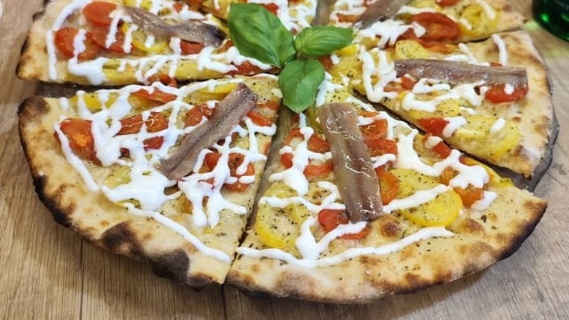 Polpa di pomodoro bio, alici del cantabrico, capperi di salina, olive taggiasche az. ficacci (castel madama), peperoni di pontecorvo DOP al forno in doppia cottura, olio evo az. cetrone