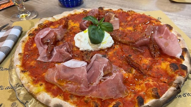 Base rossa, polpa finissima di pomodoro bio gustarosso (presidio slow food), prosciutto crudo di bassiano selezione cibaria, pomodori secchi az. ficcacci, burrata antica fattoria conato (puglia), olio evo cetrone