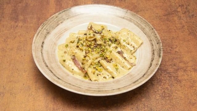 Mozzarella di bufala campana DOP, crema al pistacchio, salsiccia di suino, funghi porcini, scaglie di grana, granella di pistacchio