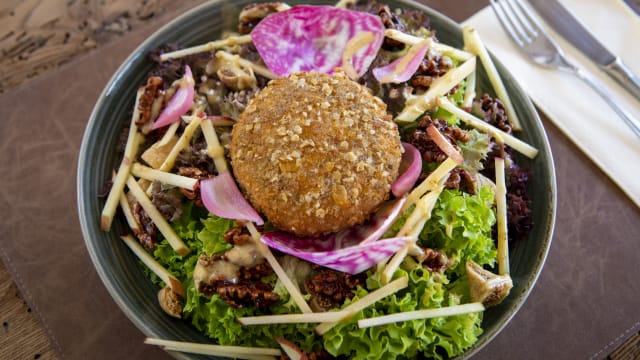 Salade verte avec tomme en croûte, figues séchées, noix caramélisées, pommes vertes et vinaigrette maison