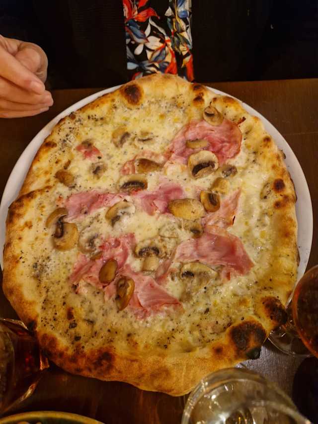 - Base tomate, mozzarella fior di latte, jambon cuit, champignons