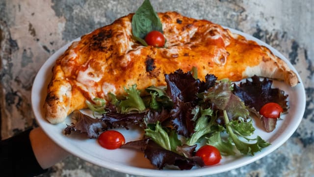 - Base tomate, mozzarella fior di latte, spianata piccante (porc), poivrons, oignons rouges, œuf