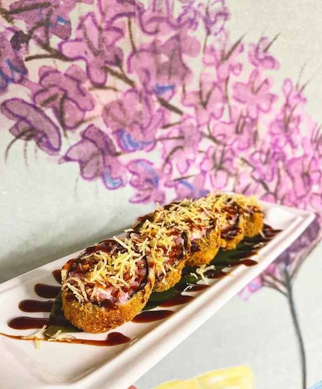 - Riso nero, philadelphia, gambero fritto, esterno spicy salmone, salsa teryiaki e pistacchi