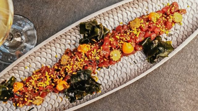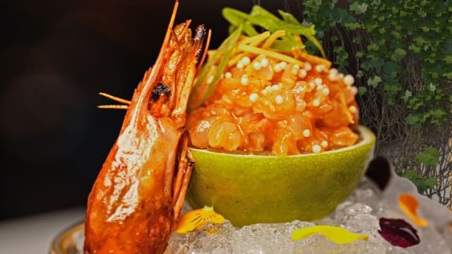 - Ensaladilla con tartar de gambas al ajillo y gambita de cristal frita