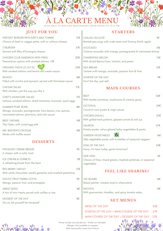 INSIDERFrenchVegetarianEuropeanBistronomicBrunchContemporary cuisineCreativeValentine's DayVegetarian dishesAmerican ExpressChildren's menuDog-FriendlyWheelchair AccessibleWifi
